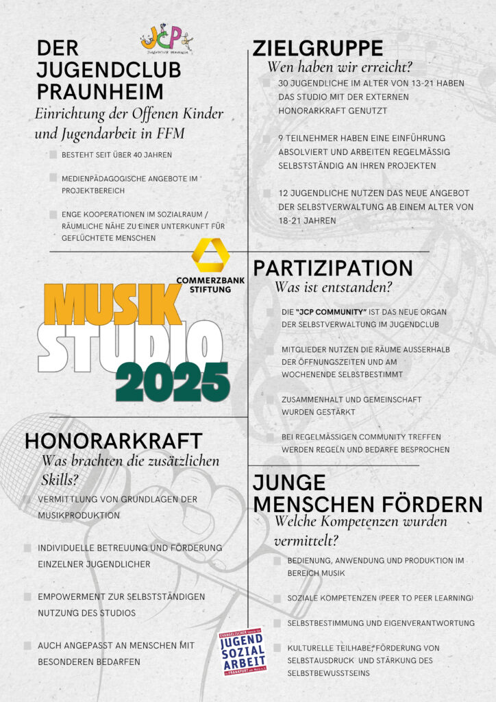 Hier ein kurzes Fact Sheet, was wir im Musikstudio dank der Commerzbank-Stiftung erreicht haben. Auch im Jahr 2026 werden wir gefördert. Danke dafür!